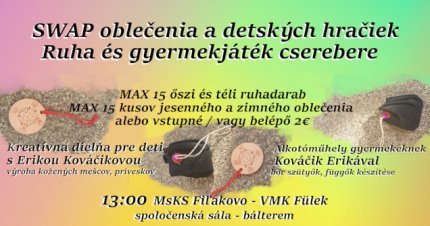 Mestské kultúrne stredisko 21. septembra o 13:00 hodine srdečne očakáva každého záujemcu na svoj jesenný swap, kde sa záujemcovia budú môcť zbaviť svojho nepotrebného ale bezchybného jesenného alebo zimného detského, dámskeho či pánskeho oblečenia a/alebo detských hračiek, a taktiež si budú môcť vybrať podobné kúsky. Niekoľko dní pred swapom, t.j. 18. septembra (streda), 19. septembra (štvrtok) a 20. septembrZverejnené 9.9.2024 -lv-